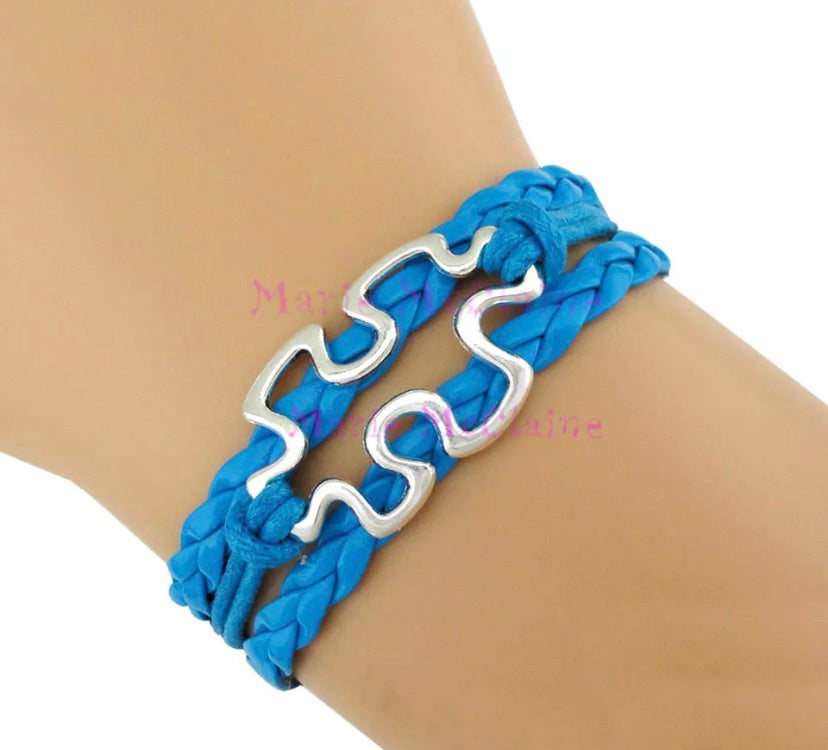Trendy and stylish autism awareness bracelet. Handcrafted, made with braided leather and metal puzzle piece. Bracelet is adjustable one size fits all.
